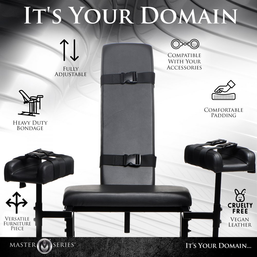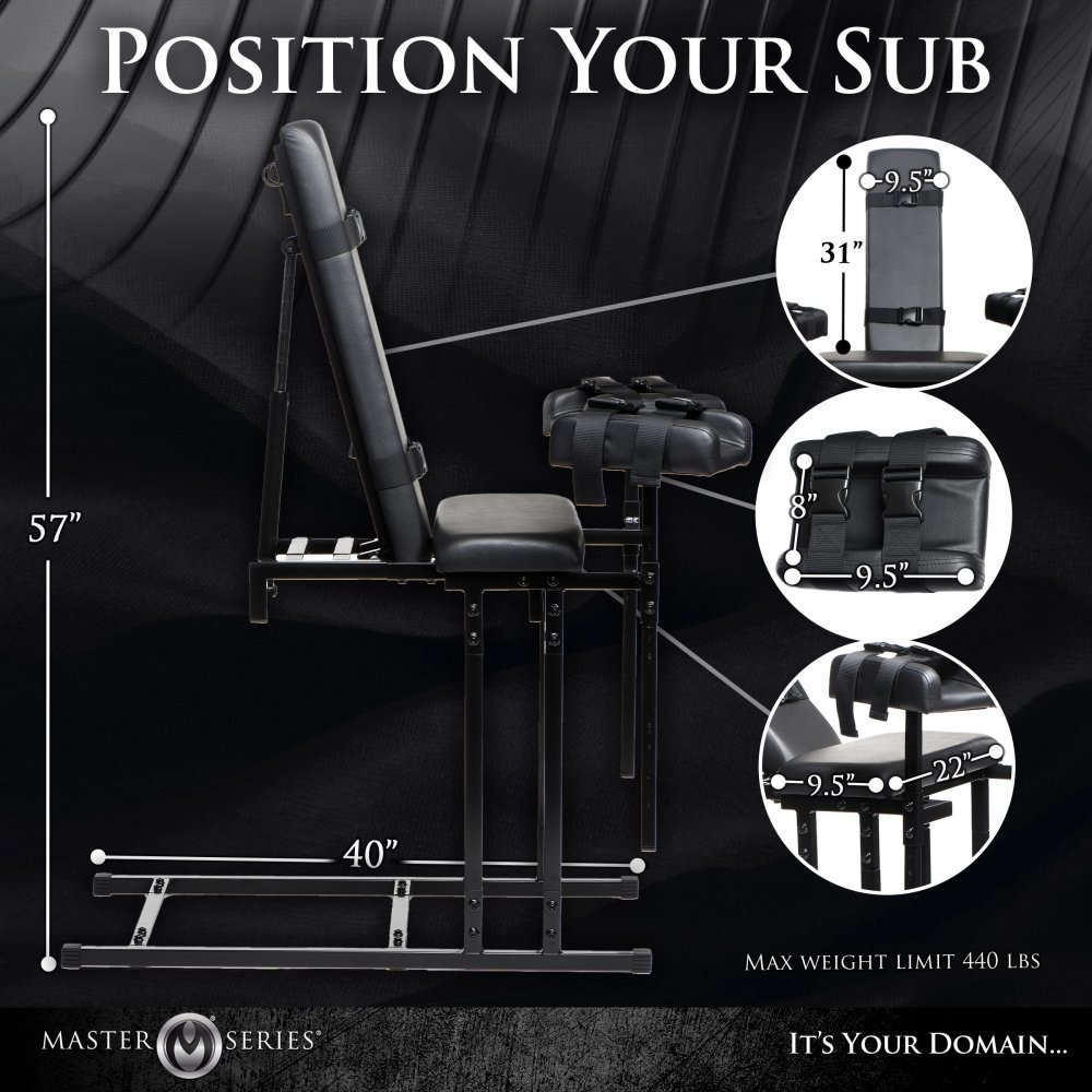 Ask your partner to climb up into the chair and try it out. Adjust the leg height and the chair backboard angle for the, and adjust any other positions and heights for yourself, as well. Once you've got the settings out of the way, bind them with the straps and buckle them in. Tease and torment them with pleasure and pain while they writhe in agony and ecstasy! Use floggers, nipple clamps, ticklers, vibrators and more while they're bound and secured, ready to receive. If you're solo and want to enjoy it yourself, strap yourself in and enjoy the support that the leg boards offer so you can really enjoy being spread wide as you play with yourself in your sexy bondage chair! Take it up a notch and combine this with the Dicktator Extreme Sex Machine and get pounded while you’re on your throne!