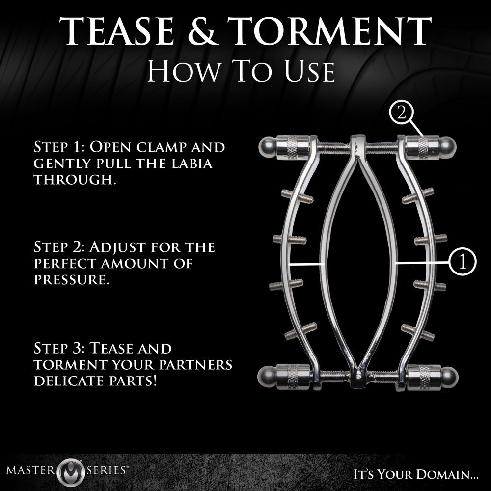 • Pinching Clamps: There are 4 pinch screws on either side of the clamps that can be adjusted using the allen wrench included. These add an extra bite of pressure against the labia for sadistic fun!