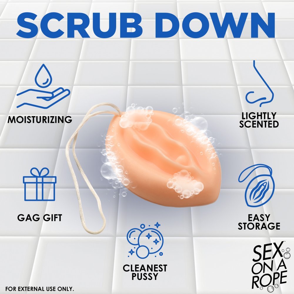 For friends with dirty minds, the best way to get clean is with a naughty gag gift of Pussy soap! This peach colored soap hangs on a nylon rope so you can keep it from losing its shape between uses (as some soaps do when placed in a soap dish). It has a flat base and the other side shows off a pretty, little vulva complete with a tiny pearl and luscious rows of lips. This soap is lightly scented and moisturizes the skin with each use. Sneak this into a gift basket today!