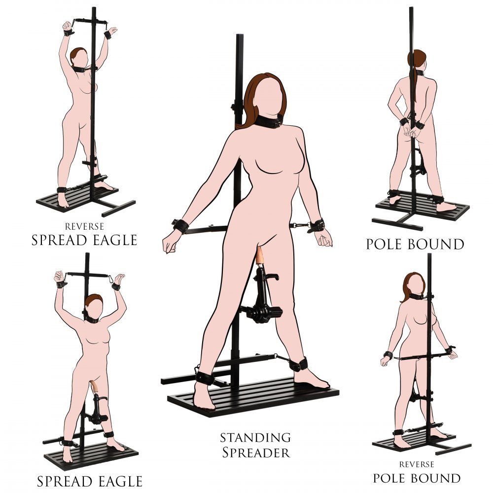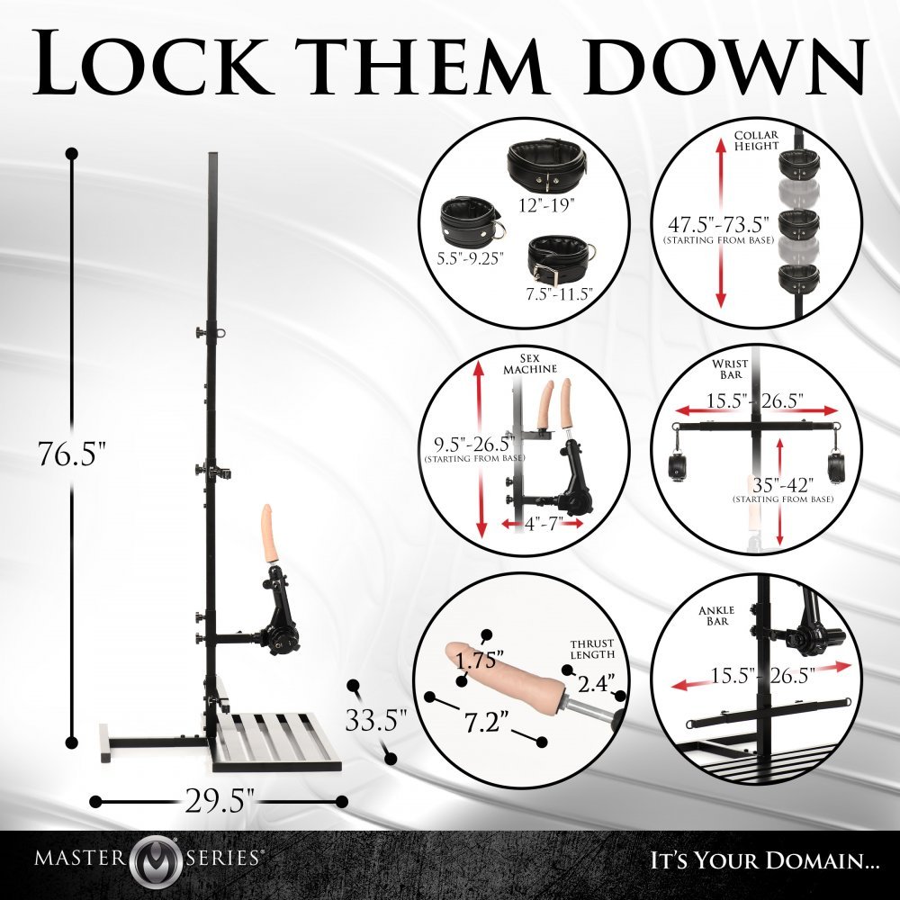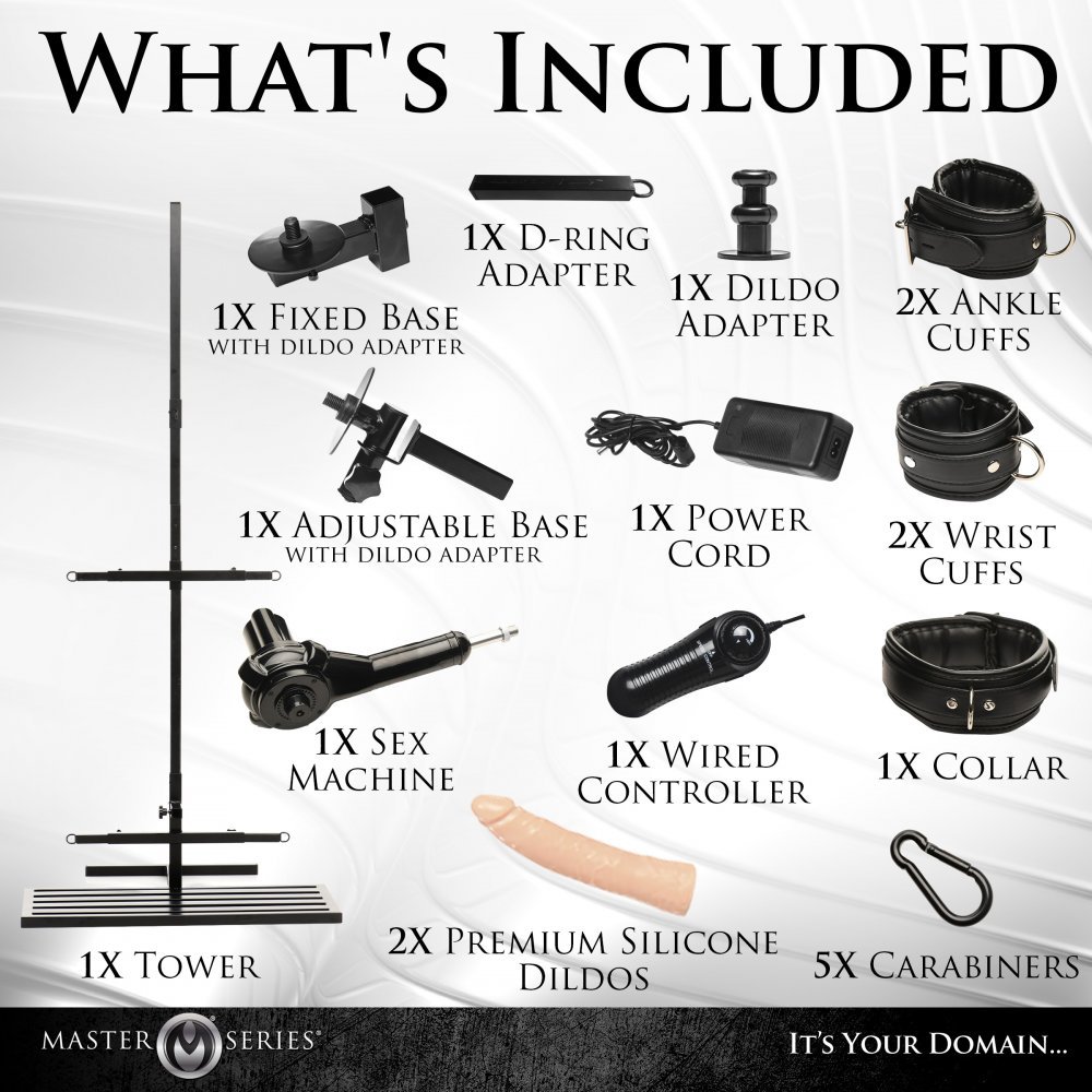 Quality Materials: This tower is made out of strong steel.Dungeon Ready: Includes 1 tower, 1 sex machine, 2 premium silicone dildos, 1 collar, 2 wrist cuffs, 2 ankle cuffs, 5 carabiners, 1 fixed base with dildo adapter, 1 adjustable base with dildo adapter, 1 D-ring adapter.Adjustable Tower: Adjust the height of the tower! Adjust the sex machine height, ankle and wrist bar widths, collar height, and overall height!Restrain Them!: Set includes vegan leather wrist and ankle cuffs and a collar. Attach them to any of the 5 D-rings.Vac-U-Lock Dongs: Includes 2 realistic looking dildos that are Vac-U-Lock compatible to work with the sex machine.Double Penetration: Use the dildo adapters to set up two dildos at once for double penetration!Multi-Speed Sex Machine: Attach to the tower and pound your partner up to 195 times per minute! Detach from the machine and use it manually, too!